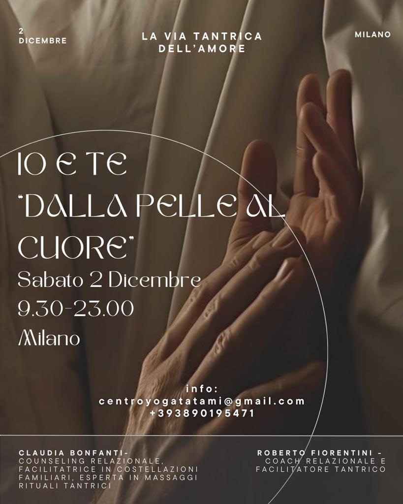 Ci prepareremo ad aprirci all’altro-altra e ad accogliere la Ritualità e la Sacralità del Massaggio, attraverso La Meditazione del Cuore e le Meditazioni in movimento delle “Cinque Onde Sonore dell’Amore”, per ri-connetterci anzitutto con il nostro corpo e prepararci a ricevere e a donare.